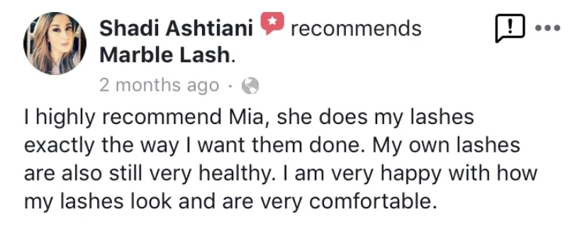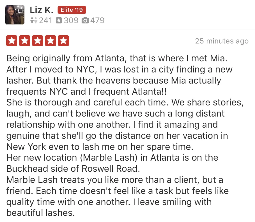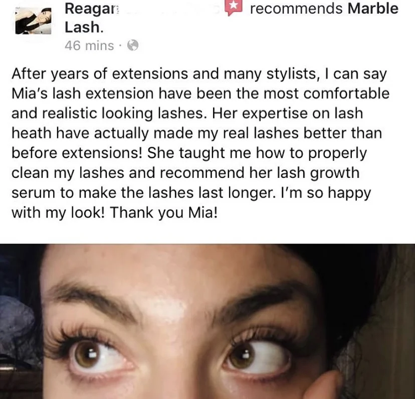“Believe the hype, eyelashes make everything better! I was referred to Marble Lash by a friend and was not disappointed at all. I was a little nervous at first because I’ve heard horrible stories but all my fears went away immediately after talking to Mia, my lash stylist… This was my first experience with eyelash extensions and now I’m addicted. Do yourself a favor and go to Marble Lash!!”