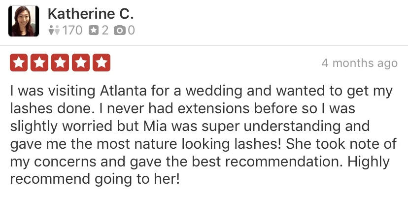 “I have been seeing Mia for nearly two years now for my lash extensions. And there’s a reason: she’s very attentive to detail and actually listens to what I want… She cares about her clientele and her work and it’s very evident.”